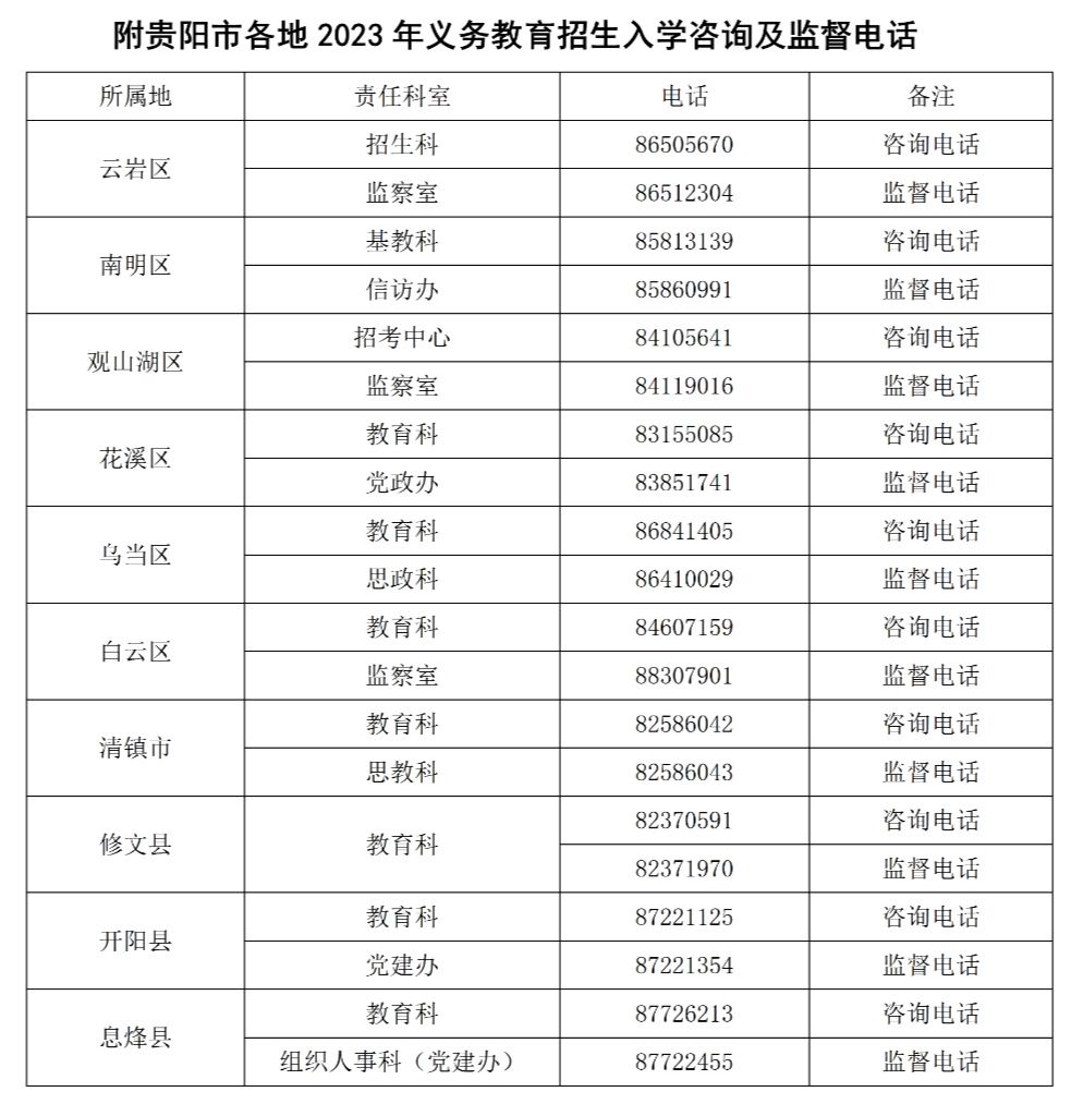 市教育局明确,贵安新区义务教育招生入学工作由花溪区教育局组织实施;贵阳国家高新技术产业开发区义务教育招生入学工作按原有政策执行,同时贵阳国家高新技术产业开发区要进一步加大义务教育学校建设力度,满足辖区内适龄儿童少年就读需要;贵州双龙航空港经济区义务教育招生入学工作由南明区教育局与双龙航空港经济区创新创业金融服务中心协商统筹安排。