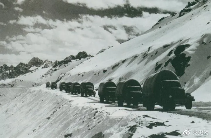1954年12月,贯通”世界屋脊”的康藏、青藏两条公路全线正式通车。图为行驶在康藏公路上的车队。