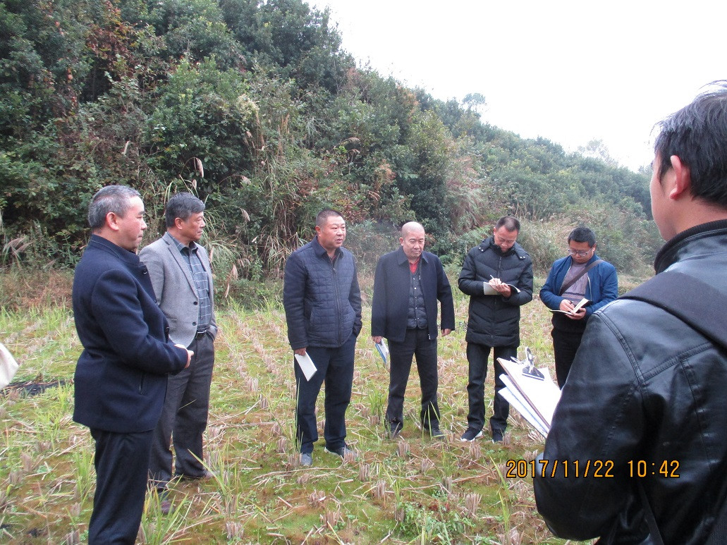 2017年11月22日,这天是二十四节气的小雪,贵州高原已经入冬。一早,刘局长一行便驱车前往花溪区麦坪镇康寨村——一七四队耕地质量调查小组施工的山间田野。气温3℃,寒气袭人,天空阴雨蒙蒙,道路泥泞。为了不耽误野外同志们的工作时间,刘局长亲自选定宣讲地点——既不在乡政府会议室,也不在农家院子;既不让工人停工等候,也不把工人事先召集过来,而是直接来到田间地头——工人施工的第一线。选定一块铺满草丛的稻田,就开始了本次宣讲。